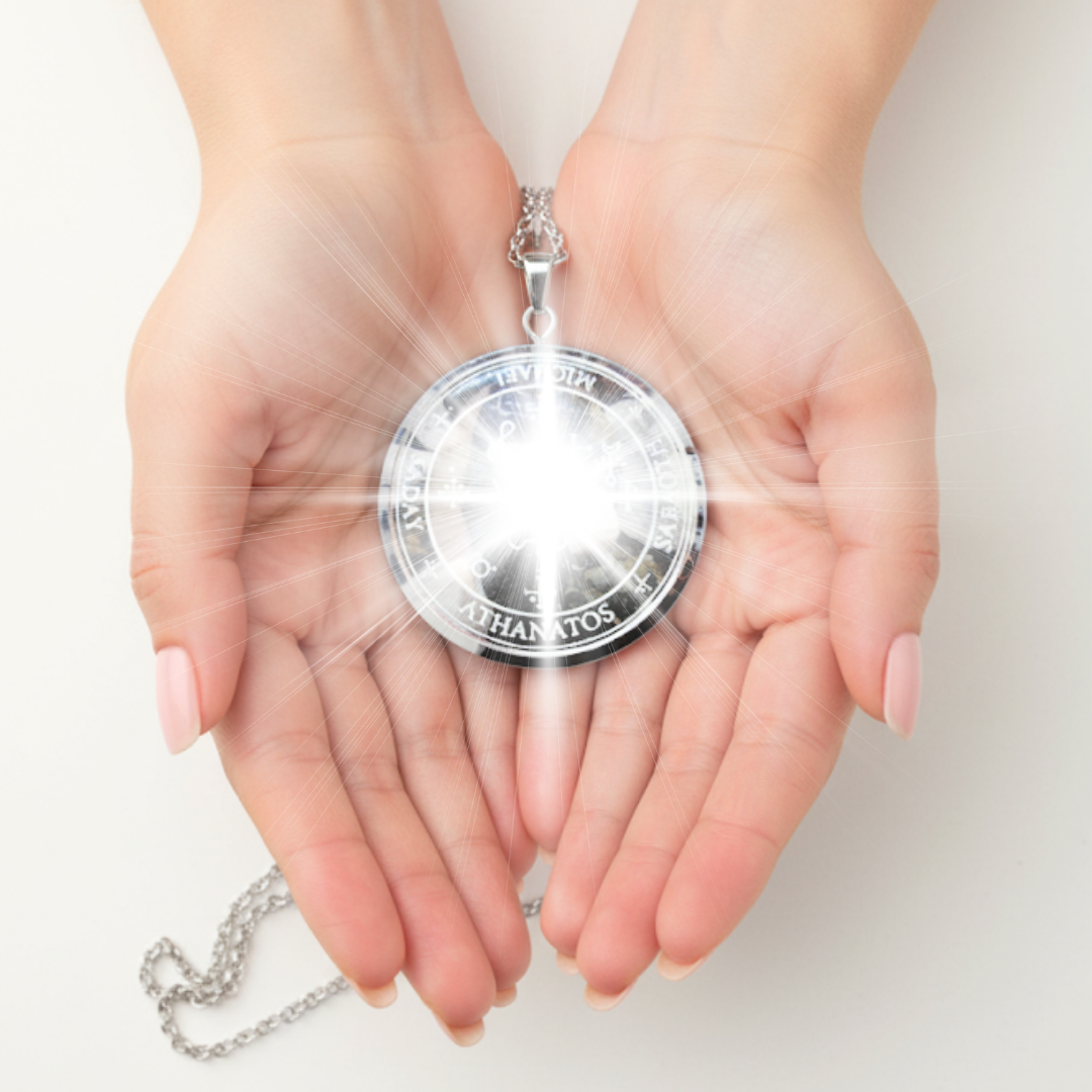 - Hold the pendant in your hands and imagine a strong light coming out of your palm and penetrating the crystals.