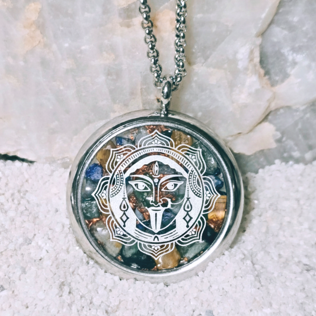 Maha Kali, a poderosa deusa do panteão hindu, representa a força da transformação radical, a destruição do ego e a libertação espiritual. Ela é a deusa do tempo, da morte e da renovação, e a sua energia é feroz e de amor absoluto. Kali evoca a força primordial que dissolve ilusões e rompe com tudo o que impede o crescimento da alma.