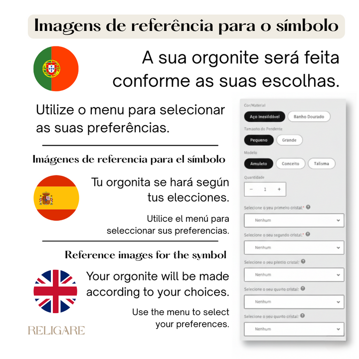 Todos os itens são feitos à mão e podem diferir das fotos. Tentamos replicar o design original, mas cada peça de joalharia será diferente, considerando os diferentes tons e tamanhos de cada cristal. Como cada cristal é único, cada orgonite também é única.